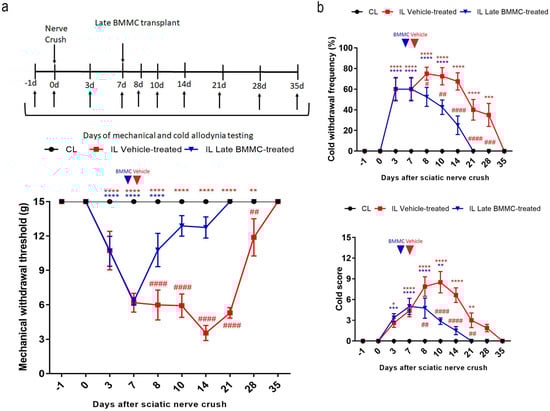 Effects of late BMMC transplant on mechanical and cold allodynia (n = 8). (a) Experimental design showing sciatic nerve crush, transplant, and pain-like behavioral test times. Mechanical withdrawal threshold calculated as 50% g threshold = (10 Xf + kd)/10,000, where Xf = value (in log units) of the final von Frey hair used; k = tabular value for the pattern of positive/negative responses; and d = mean difference (in log units) between stimuli. (b) Cold withdrawal frequency calculated as (N° of trials accompanied by brisk foot withdrawal) × 100/(N° of total trials); cold withdrawal score: 0 = no response, 1 = quick withdrawal, flick or stamp of the paw; 2 = prolonged withdrawal or repeated flicking (≥2) of the paw; 3 = repeated flicking of the paw with licking directed at the ventral side of the paw. Results correspond to contralateral (CL, black circle) pools data from vehicle-treated and late BMMC-treated rats and ipsilateral (IL) hind paws of vehicle-treated (red square) and late BMMC-treated rats (blue triangles). Values are expressed as mean ± SD. Blue arrows indicate the time-point of vehicle or BMMC administration. Statistical analysis performed through two-way ANOVA followed by Bonferroni post-hoc test. p < 0.0001 among groups in B and C; ## p < 0.001, ### p < 0.001, #### p < 0.0001 (IL vehicle-treated vs. IL late BMMC-treated); red * p < 0.05, ** p < 0.001, *** p < 0.001, **** p < 0.0001 (IL vehicle-treated vs. CL); blue ** p < 0.001, *** p < 0.001, **** p < 0.0001 (IL late BMMC-treated vs. CL).