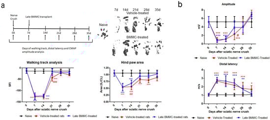 Distal latency showed a significant increase in both experimental groups from 7 dpi and up to 28 dpi, with no statistically significant differences between them (Figure 3b). However, a tendency toward a faster but not significant recovery was noticed in late BMMC-transplanted rats at 35 dpi.