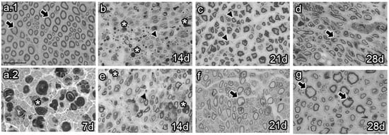 Ultrastructure images (n = 3, 3000×, scale bar 2 µm). Images from thin section, for ultrastructure analysis of naïve rats (a.1), seven-days-post-sciatic nerve crush rats (a.2), vehicle-treated (b–d), and late BMMC-treated (e–g) rats at different survival times. Arrows indicate healthy axons, asterisks indicate myelin and axon debris, and arrowheads indicate newly formed axons.