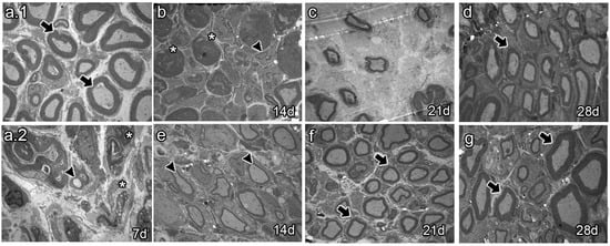 Ultrastructural analyses of sciatic nerves (Figure 5) showed mostly myelinated axons of large caliber in naïve animals (Figure 5a.1, arrows). Seven and fourteen dpi, vehicle-treated animals only showed degenerating axons and myelin debris (Figure 5a.2,b, arrow heads and asterisk, respectively). Myelin and axon debris disappeared at 21 dpi, and newly formed myelinated axons were observed of large caliber and unusual shape (Figure 5c). As spontaneous regeneration proceeded, axons of large caliber with a thin myelin layer and naïve-like shape were observed at 28 dpi (Figure 5d, arrow). In turn, the BMMC-treated group showed some myelinated axons of large caliber wrapped by a thin myelin layer at 14 dpi (Figure 5e, arrow heads). Axons became more myelinated at 21 dpi and acquired a normal myelin sheath and shape at 28 dpi (Figure 5g, arrows).