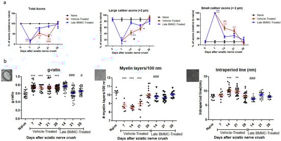 Regarding the g-ratio (Figure 6b), an increase was observed in vehicle-treated animals 7 dpi as compared to naïve animals (0.75 ± 0.08). The g-ratio remained high, up to 28 dpi in the vehicle-treated group, but recovered normal values from 21 dpi in the BMMC-treated group (0.60 ± 0.1). The number of myelin layers per 100 nm decreased at 7 dpi in vehicle-treated rats (8.69 ± 0.58) and remained significantly different from naïve nerves until 28 dpi (9.98 ± 0.78); in the BMMC-treated group, no significant differences were observed from naïve nerves from 14 dpi (9.76 ± 0.52). Finally, the intraperiod line revealed significant differences only at 14 and 21 dpi (10.19 ± 1.4 and 9.73 ± 1.4) in sciatic nerves from animals in the vehicle-treated group.