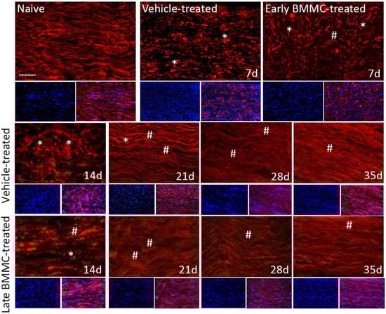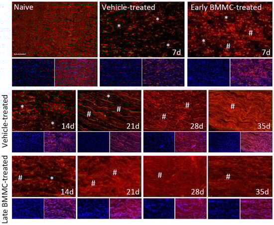 Immunohistochemical effects of late BMMC transplant on βIII-tubulin-like immunoreactivity (n = 5, 20×, scale bar 50 µm). Longitudinal sections from naïve nerves and the distal area (3–6 mm after crush) of vehicle- and early-BMMC-treated animals analyzed 7 dpi. Sections from the distal area of ipsilateral nerves of vehicle- and late BMMC-treated rats analyzed at different dpi. In blue is shown DAPI immunostaining for nuclei and, in red, βIII-tubulin immunostaining. Asterisks indicate βIII-tubulin clusters and hashtags indicate newly synthetized myelin.