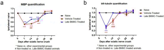 IOD quantification of MBP (a) and βIII-tubulin (b) (n = 5). IOD quantification shown as the mean ± SEM relative to naïve nerves. Statistical analysis performed through two-way ANOVA was followed by Bonferroni post-hoc test. *** p < 0.001 (naive vs. other experimental groups); ## p < 0.01; ### p < 0.001 (vehicle-treated vs. late BMMC-treated animals). Significance was set at p < 0.05.
