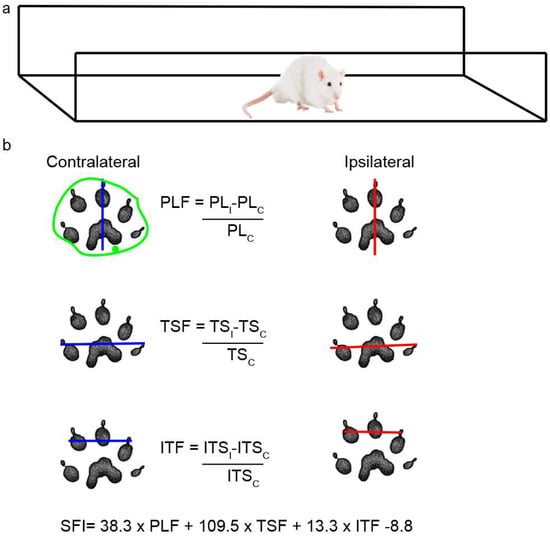 Scheme of walking track analysis. (a) Acrylic walkway (120 cm × 15 cm, ending in a darkened cage) used for walking track analysis. (b) In the footprint obtained, the length of the footprint from the third toe to the end of the foot (PL) and the distance between the first and fifth toe (TS) and between the second and fourth toes (ITS) were measured in both the CL and IL sides. The green outline shows an example of how each area was determined.