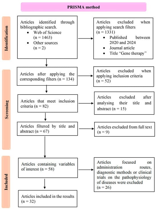 Exclusion criteria included studies that were not peer-reviewed, not available in English, or not published in indexed academic journals. Additionally, studies were excluded if they focused on nongenetic therapeutic approaches or addressed diagnostic methods or administration routes without direct evaluation of gene therapy. Publications that did not match the search descriptors or that examined diseases outside the scope of interest were also excluded. Finally, studies published before 2020 were excluded from the review.