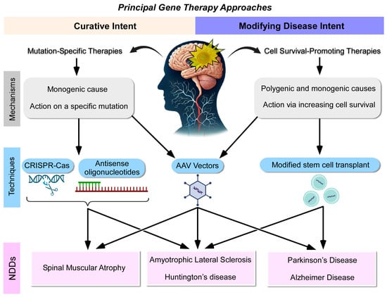 The review analysis highlights two principal gene therapy approaches for neurodegenerative diseases (NDDs). Therapies with curative intent involve the introduction of a corrective gene or oligonucleotide using adeno-associated viral (AAV) vectors or gene-editing techniques (CRISPR-Cas and antisense oligonucleotides), targeting diseases caused by specific genetic mutations. In contrast, therapies with a cell-survival-promoting intent utilize adenoviral vectors or stem cell transplantation to deliver factors that enhance cellular survival. This latter approach can be applied to both monogenic and polygenic neurodegenerative diseases, offering broader therapeutic potential.