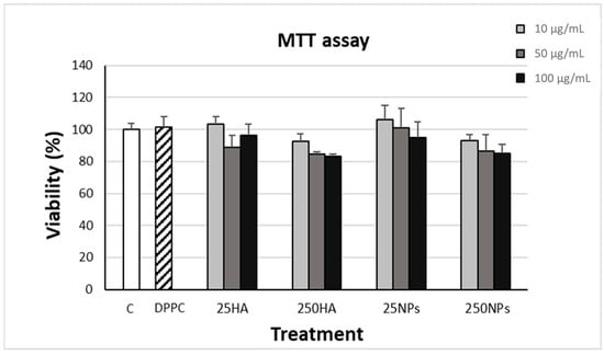 At first, the MTT assay was set up to exclude any potential cytotoxicity deriving from the addition of DPPC and HA in solution or in the form of NPs at three increasing concentrations. The obtained results indicated a high biocompatibility of all considered conditions, showing no reduction of viability with respect to control.
