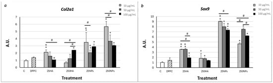 Gene expression of Col2a1 (a) and Sox9 (b) in horse chondrocytes cultured in adhesion for 2 weeks with different concentrations (10, 50, and 100 µg/mL) of 25HA, 250HA, 25NPs, or 250NPs compared to non-treated cells (C) and cells treated with DPPC in solution (10 µg/mL). * Statistically significant differences between each sample and the control. # Statistically significant difference between the different concentrations within each HA or NP treatment group. ° Statistically significant difference between the two different HA types or NP types within each concentration group. Values are mean ± SD, n = 4/6 (p < 0.05).
