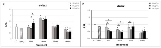 Gene expression of Col1a1 (a) and Runx2 (b) in horse chondrocytes cultured in adhesion for 2 weeks with different concentrations (10, 50, and 100 µg/mL) of 25HA, 250HA, 25NPs, or 250NPs compared to non-treated cells (C) and cells treated with DPPC in solution (10 µg/mL). * Statistically significant differences between each sample and the control. # Statistically significant difference between the different concentrations within each HA or NPs treatment group. ° Statistically significant difference between the two different HA types or NP types within each concentration group. Values are mean ± SD, n = 4/6 (p < 0.05).