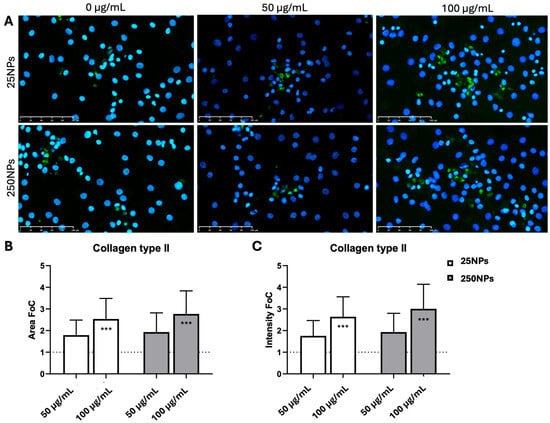 (A) Immunofluorescence staining for collagen type II on primary chondrocytes after 2 weeks of culture in adhesion with different concentrations (0, 50, and 100 µg/mL) of 25HA NPs or 250HA NPs. Collagen type II—FITC (green); Nuclei—DAPI (blue). Scale bar = 100 μm. Histograms of collagen type II quantification in the various conditions: (B) area and (C) intensity of IF marker detection express as fold of change; 25NPs are in blank, 250NPs are in grey (*** p < 0.001).