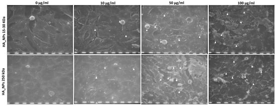 Scanning electron microscopy (SEM) of primary chondrocytes after 2 weeks of culture in adhesion with different concentrations (0, 10, 50, and 100 µg/mL) of 25NPs or 250NPs. The arrowheads indicate the secreted extracellular matrix. Scale bar = 10 μm.
