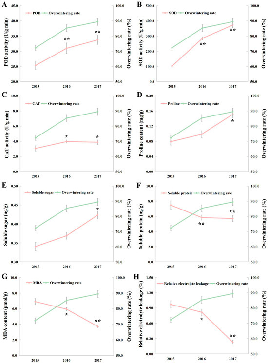 Effects of OWR on physiological and biochemical changes in the winter rapeseed seedlings cultivated in 2015, 2016, and 2017. (A) POD; (B) SOD; (C) CAT; (D) proline; (E) soluble sugar; (F) soluble protein; (G) MDA; (H) REL. The values are means ± standard deviation from three biological replicates (**, p < 0.01; *, p < 0.05).