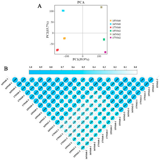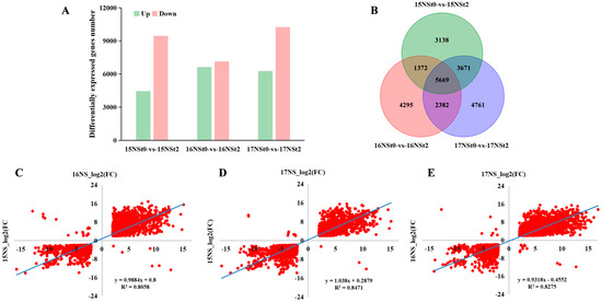The PCA analysis demonstrated that the three biological replicates of 15NSt0, 16NSt0, 17NSt0, 15NSt2, 16NSt2, and 17NSt2 exhibited strong conformity (Figure 3A and Table S2), and their correlation coefficient exhibited a value exceeding 0.9 (Figure 3B). This indicates a substantial level of reliability in the transcriptome analysis.