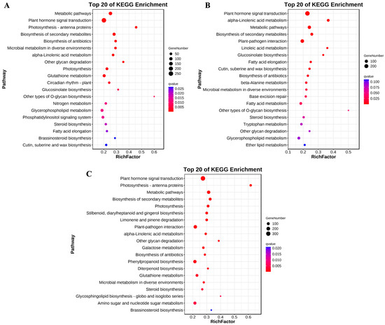 The top 20 KEGG pathways enriched by DEGs in 15NS (A), 16NS (B), and 17NS (C) under freezing stress.