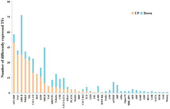 Totally, 530 differentially expressed TFs were screened from the candidate genes within the leaf transcriptome of NS exposed to freezing stress (Table S7). Among these, the majority of the up-regulated differentially expressed TFs were classified as ethylene response factor (AP2/ERF), NAC domain-containing protein (NAC), WRKY transcription factor (WRKY), TIFY protein (TIFY), HSF, MADS-box protein (MADS), and TAZ domain-containing protein (TAZ). The predominant portion of the down-regulated differentially expressed TFs were categorized as belonging to the bHLH (bHLH), trihelix, C2C2-GATA, mMTEF, and squamosa promoter-binding-like (SBP) transcription factor families (Figure 6). It is worth noting that all the HSFs were significantly up-regulated after freezing stress. These findings suggest that TFs, especially HSFs, were closely related to freezing stress.