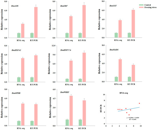A comprehensive comparison of mRNA expression profiling and RNA-seq quantification in winter rapeseed NTS57 after freezing treatment. The values denote the mean ± standard deviation obtained from three biological replicates.
