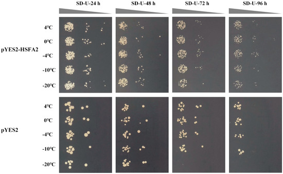 Phenotypic characterization of the BnaHSFA2 gene in yeast under low temperatures (4, 0, −4, −10, and −20 °C) for 24, 48, 72, and 96 h, respectively.