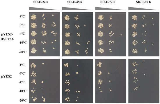 To further identify whether the candidate genes are able to respond to freezing stress, the BnaHSFA2 and BnaHSP17.6 were transformed into yeast cells; all transformations were grown in the SD-Ura solid medium. The yeast phenotypic analysis showed that the growth of cells carrying pYES2 (control) was more severely affected compared to the pYES2-BnaHSFA2 at 4, 0, −4, −10, and −20 °C, respectively, and the cells carrying pYES2 basically did not grow after 72 h and 96 h of treatment at −20 °C (Figure 8). The cells carrying pYES2 were more sensitive to low temperatures (4, 0, −4, −10, and −20 °C) than the pYES2-BnaHSP17.6, which grow well after 72 h and 96 h of treatment at −20 °C (Figure 9). These results suggest that BnaHSFA2 and BnaHSP17.6 can improve cold tolerance in yeast cells.