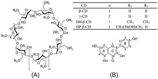 Cyclodextrins (CDs, shown in Figure 1A) [1,2] are natural cyclic oligosaccharides, classified into three primary categories based on the number of D-(+)-glucopyranose units linked by α-1,4 glycosidic bonds: α-cyclodextrin (α-CD), β-cyclodextrin (β-CD), and γ-cyclodextrin (γ-CD). Specifically, α-CD comprises six units, β-CD seven units, and γ-CD eight units [3]. CDs deviate from a perfect cylindrical form because the chemical bonds between glucopyranose units lack free rotation; instead, they exhibit a toroidal or cone-like configuration [4]. They display a hydrophilic nature with hydroxyl groups on their external surface and a hydrophobic cavity at the center. This structural uniqueness allows CDs to form non-covalent inclusion complexes by encapsulating guest molecules partially or fully within their central cavity, which can greatly affect the solubility, stability, and physicochemical characteristics of the guest [5]. However, the inherent hydrogen bonding within natural CDs results in poor water solubility, a property that presents a significant challenge to their potential applications in various fields. To address this limitation, chemically modified CDs such as heptakis-O-(2-hydroxypropyl)-β-cyclodextrin (HP-β-CD) and heptakis-O-(2,6-di-O-methyl)-β-cyclodextrin (DM-β-CD) have been developed. These derivatives, along with their inclusion complexes, are widely applied in fields like food, pharmaceuticals, and cosmetics [6].