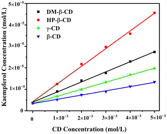 The slope is derived from the plot of Kae concentration versus CD concentration, while s0 represents the aqueous solubility of Kae. Based on the results of preliminary experiments, the s0 of Kae was determined to be 3.599 × 10−6 mol·L−1.