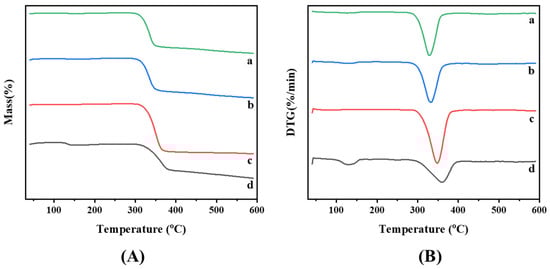 Thermogravimetric analysis was conducted using a STA449 F5 thermal analyzer (NETZSCH, Selb, Bavaria, Germany). Samples weighing between 2.0 and 2.5 mg were subjected to a heating process, increasing the temperature from room temperature to 590 °C at a rate of 10 °C per minute.