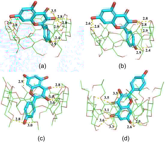 Figure 6d shows that the A and C rings of Kae were accommodated within the HP-β-CD cavity, while the B ring was positioned at the secondary rim. Numerous hydrogen bonds can be observed between the host and guest, suggesting that both hydrogen bonding and hydrophobic interactions played key roles in forming the HP-β-CD/Kae complex. As also reported by Wang et al. [26], an intramolecular hydrogen bond was observed between the C4 carbonyl group and the C6 hydroxyl group.