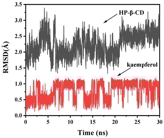The structural stability of the HP-β-CD/Kae complex obtained from the lowest-energy molecular docking solution was estimated using 30-ns molecular dynamics (MD) simulations. Figure 7 illustrates the average root-mean-square deviation (RMSD) values for both host and guest molecules in relation to their initial positions. The system rapidly stabilized at the start of the MD simulation, with only slight atomic position fluctuations for both the host and guest. The mean RMSD for HP-β-CD and Kae were 2.230(2) Å ± 0.341(8) Å and 0.786(4) Å ± 0.266(0) Å, respectively. These results suggest minimal positional changes and structural deformations for both molecules, confirming the structural stability of the complex as indicated by the lowest-energy molecular docking result.