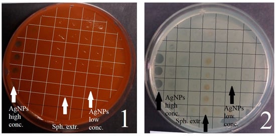The mechanisms of action of silver nanoparticles on a living cell differ from the action of sphagnum extracts and can be different: these are interaction with the cell wall, penetration through the membrane, production of reactive oxygen species, DNA damage, and inhibition of protein synthesis [,]. However, the effect of such an effect on the cell is not always negative. As for mammalian cells, the production of reactive oxygen species because of exposure to small silver nanoparticles can enhance the process of adipogenesis of white cells []. Many researchers claim that silver nanoparticles are not toxic to human cells, for example, with respect to peripheral blood mononuclear [] or fibroblasts []. These data give hope that nanoparticles that are not dangerous to humans will be able to selectively destroy cells of pathogenic bacteria and yeast, for which they are toxic. Their toxicity depends on their shape, size, and surface modification [].