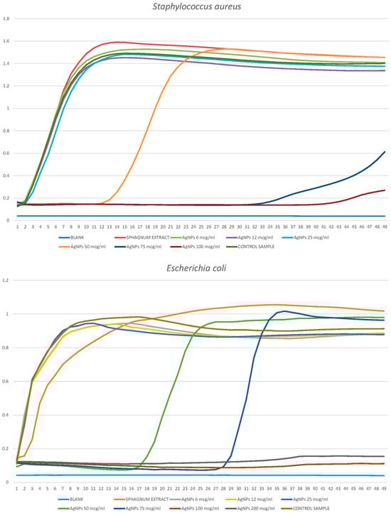 Determination of the antibacterial activity of biogenic silver nanoparticles and sphagnum extract against S. aureus and E. coli by the method of constructing growth curves. The concentrations of nanoparticles are given in the captions.