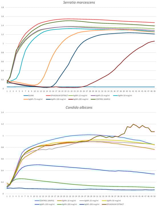 Determination of the antibacterial activity of biogenic silver nanoparticles and sphagnum extract against S. marcescens and C. albicans by constructing growth curves. The concentrations of nanoparticles are given in the captions.