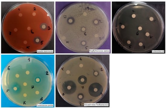 As a result of disco-diffusion analysis, the size of the antibiotic inhibition zone (streptomycin, tetracycline, ceftriaxone, ciprofloxacin, erythromycin, and amoxicillin) was determined for S. aureus, S. marcescens, P. putida, A. borkumensis, and E. coli. (Figure 4). Each 6 mm disc contained 10 μL of antibiotic, with a concentration of 10 μg/mL. In subsequent studies, one most effective antibiotic was selected for each bacterium. In the further studies, we selected amoxicillin for S. aureus [], ciprofloxacin for S. marcescens, E. coli, and P. putida [], and ceftriaxone [] for A. borkumensis.