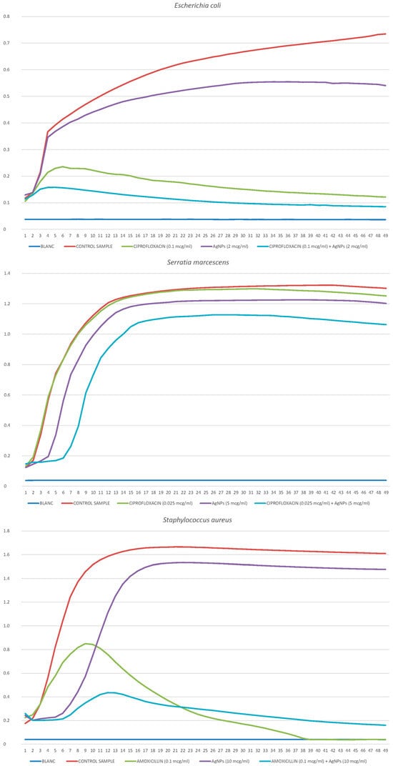 Growth curves of E. coli, S. marcescens, and S. aureus cultivated in the presence of the antibiotic (ciprofloxacin or amoxicillin) and silver nanoparticles.