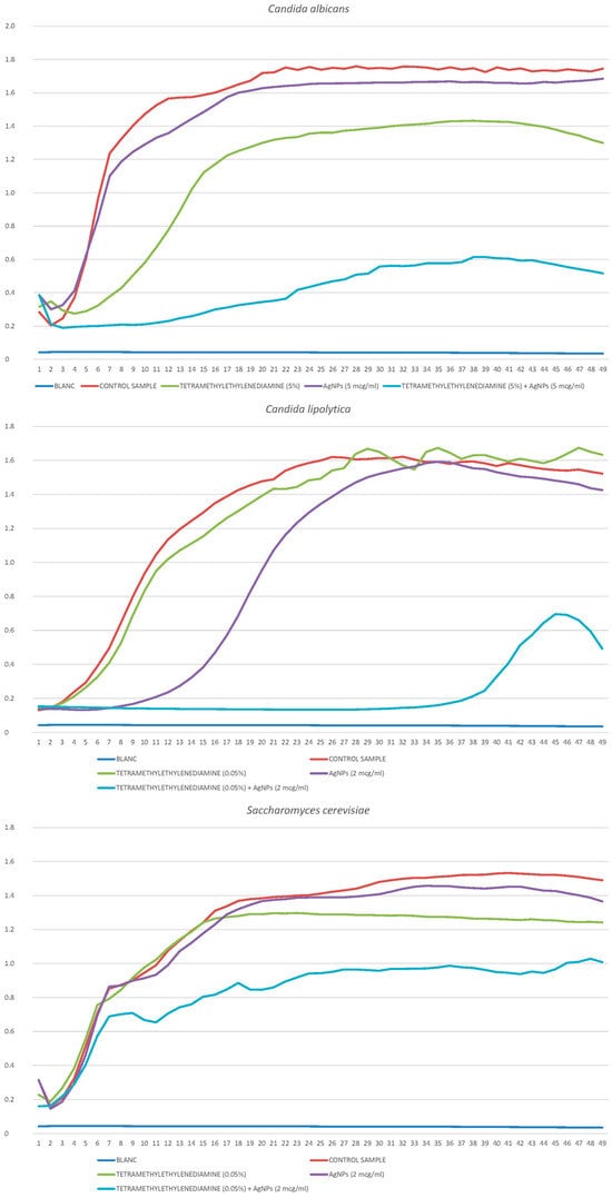 Growth curves of C. albicans, C. lipolytica, and S. cerevisiae cultivated in the presence of tetramethylenediethylenetetramine and silver nanoparticles.