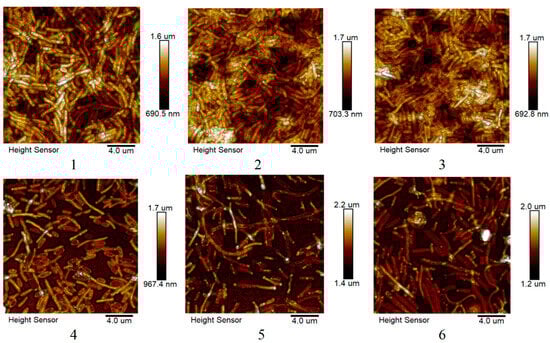 Images of S. marcescens biofilms obtained by atomic force microscopy cultured in the presence of silver and ciprofloxacin nanoparticles. 1—control sample, 2—biogenic silver nanoparticles, 3—chemically synthesized silver nanoparticles, 4—antibiotic, 5—biogenic silver nanoparticles with the addition of an antibiotic, and 6—chemically synthesized silver nanoparticles with the addition of an antibiotic.