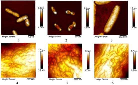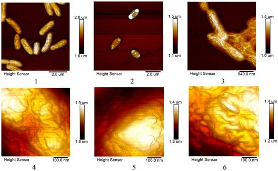 Images of the general appearance and surface of S. marcescens cells cultured in the presence of silver nanoparticles and sphagnum extract were obtained using atomic force microscopy. 1, 4—control sample, 2, 5—silver nanoparticles, 3, 6—sphagnum extract.