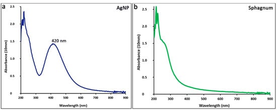 Silver nanoparticles are currently synthesized in numerous ways: chemical (chemical reduction, microemulsion, and photochemical method), physical (laser ablation, irradiation, evaporation, condensation), and biological (using plants, bacteria, or fungi) []. Biological methods are considered to be the most environmentally friendly. In this case, biogenic nanoparticles are even labeled “Bio-AgNPs”. Most often, a plant extract is used for synthesis; the process takes place at a low (20–60 °C) temperature and without the use of any harmful chemicals [,,,,]. The precursor is silver nitrate, which is reduced by a plant extract, while the nanoparticles “build up” in solution according to the “bottom-up” principle. A film of reducing agent can form on the surface of the particles, which can give them additional properties, for example, an obstacle to the formation of conglomerates []. Given that many researchers expect to create an antimicrobial product, they try to use plant extracts in such a synthesis, which themselves have antibacterial properties. In our study, Sphagnum fallax moss was chosen as such a plant. We used this type of moss as the basis for the preparation of an extract, which was used as a reducing agent in the biogenic synthesis of silver nanoparticles. Sphagnum mosses are known for their wound healing and bacteriostatic properties [,]; they are even traditionally used as a dressing material []. Recent studies have shown that secondary metabolites of the S. fallax have a pronounced antimicrobial effect []. The mechanism of action of this moss on bacteria has not been fully studied, but it seems to be related to a substance contained in it called Sphagnol [].