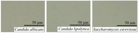 As a result of a similar disco-diffusion analysis, it was found that there was no inhibitory effect from copper sulfate and chloramine B, but Desgran inhibited all three types of yeast (Figure 5). Thus, Desgrane (tetramethylenediethylenetetramine) was chosen as an effective fungicide for all three species to build growth curves. C. lipolytica turned out to be the most susceptible species, S. cerevisiae was also sensitive to a concentration of 3.5%, and C. albicans inhibited only the maximum concentration—35%.