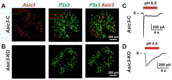 Functional acid-sensing ion channels are found in roughly 25% of the bladder sensory neurons []. Genetic deletion of the Asic3 subunit eliminates the ability of bladder sensory neurons to generate action potentials in response to extracellular acidification [,], producing a functional ASIC knockout. Here, to delete Asic3 from sensory neurons, we used a transgenic line that expresses Cre recombinase driven by the advillin (Avil) gene promoter in a constitutive manner (Avil-Cre) []. Note that Avil is almost exclusively expressed in sensory neurons [], but not in other neuronal tissues apart from Mo5 motoneurons []. To confirm that Avil-driven Cre-mediated recombination eliminates Asic3 from sensory neurons we used fluorescence in situ hybridization (FISH). As shown in Figure 1, Asic3 expression is absent in sensory neurons of conditional Asic3-KO (Asic3fl/fl; Avil-Cre+/−) mice. No obvious changes in P2x3 expression in sensory neurons were observed between control (Asic3-C, Asic3fl/fl) and conditional Asic3-KO mice. Additionally, we performed patch-clamp studies to confirm that the genetic deletion of Asic3 alters ASIC function in sensory neurons. Consistent with previous reports [,,,], conditional deletion of Asic3 slowed the desensitization of the proton-activated currents in sensory neurons (Figure 1C,D).