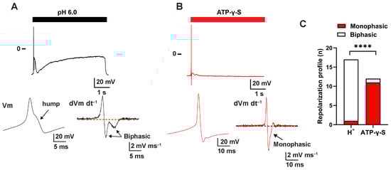 To understand how ASIC activation affects the sensory neuron function, we compared the repolarization profile of action potentials evoked by acidification or ATP-γ-S. The latter, a P2X agonist, was selected because it is known to produce generator potentials in bladder sensory neurons [,,]. Visual inspection of action potentials evoked by acidification from previously published data reflects a characteristic “hump” (Figure 2A) that renders a biphasic shape upon differentiation (16/17 neurons) (Figure 2C). Note that while the properties of action potential evoked by acidification in this data set were previously reported [], the repolarization profile analysis is new and has not been published previously. This hump is typically seen upon activation of VGCCs in dorsal and trigeminal sensory neurons [,] and it has been previously reported as a distinctive feature of the action potentials of nociceptive afferents []. In contrast, only 1 out of 12 action potentials evoked by ATP-γ-S exhibit a biphasic repolarization profile (Figure 2B,C). These results suggest functional coupling between ASICs and VGCCs in sensory neurons.