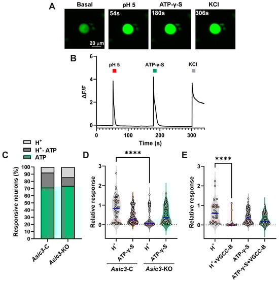 ASICs are functionally coupled to voltage-gated Ca2+ channels in sensory neurons. Dorsal root ganglia (DRG) were isolated from control (GCaMP5G+/−; Avil-Cre+/−) and conditional Asic3-KO (Asic3fl/fl;GCaMP5G+/−; Avil-Cre+/−) mice expressing GCaMP5G in sensory neurons. Ca2+ transients were examined in cultured sensory neurons 24–72 h after isolation. (A), Representative images showing proton and ATP-γ-S evoked Ca2+ transients in sensory neurons from control mice. (B), Representative tracing showing the change in fluorescence (ΔF/F) overtime for a sensory neuron from a control mouse. Sensory neurons were exposed to an extracellular acidic solution (red line), ATP-γ-S (green line) and lastly to a high K+ (KCl) solution (gray line) (see Section 4 Materials and Methods). (C), Percentage of sensory neurons that respond to extracellular acidification, ATP-γ-S, or both (n = 192–210). (D), Asic3 is required for proton-evoked [Ca2+]i transients in sensory neurons. Data, normalized to the Ca2+ transient evoked by KCl, are shown as the mean ± SEM (n = 55–178). Data were analyzed using Kruskal–Wallis test followed by Dunn’s multiple comparison test and a significant difference is indicated with a quadruple asterisks (p ≤ 0.0001). (E), Proton-evoked Ca2+ transients are mediated by voltage-gated Ca2+ channels (VGCCs) in sensory neurons. Neurons were exposed to an acidic solution or a solution containing ATP-γ-S (10 μM) in the absence or presence of VGCC blockers (VGCC-B; ω-conotoxin MVIIC, 100 nM; mibefradil, 10 μM; nifedipine, 10 μM). Data, normalized to the Ca2+ transient evoked by KCl, are shown as the mean ± SEM (n = 39–91). Data were analyzed using Kruskal–Wallis test followed by Dunn’s multiple comparison test and a significant difference is indicated with a quadruple asterisk (p ≤ 0.0001).