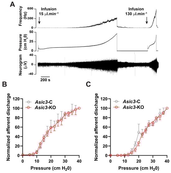 We previously reported that the global genetic deletion of the Asic3 subunit reduces voiding volume, and the pressure required to trigger micturition []. Although ASIC3 is primarily expressed in sensory neurons [], Asic3 mRNA has been detected in other tissues [,,,,,,,] including the brainstem [], an area that contains multiple neural circuits that can profoundly inhibit or facilitate incoming sensory information from the urinary bladder []. Therefore, to unambiguously define the function of ASICs in the sensory neurons that innervate the urinary bladder, we measured afferent discharge in response to bladder distension in tissues harvested from naïve control and sensory neuron conditional Asic3-KO mice. For these experiments, the bladder, urethra and associated pelvic nerve roots were harvested and mounted in a temperature-regulated chamber that allows recording of single-unit afferent activity during continuous filling [,,]. To record afferent nerve activity, a spinal root (L6 or S1) was carefully positioned in a glass suction electrode and the urinary bladder was continuously filled at a rate of 15 μL·min−1. As expected, afferent discharge increased during continuous filling in bladders from both control and conditional Asic3-KO mice (Figure 4A,B). No significant difference in afferent discharge/intravesical pressure relationships was noted between the two groups when bladders were filled at a physiological rate of 15 μL·min−1 (Figure 4B). This result indicates that ASICs in afferents are not essential for normal bladder function. To determine whether ASICs play a role when bladder wall distension is strained to the limit, we measured afferent discharge during fast filling (130 μL·min−1) (Figure 4A,C). Analogously, no significant difference in the afferent discharge/intravesical pressure relationships was seen between Asic3-C and conditional Asic3-KO mice (Figure 4C). Thus, ASICs do not play a role in the transduction of signals related to distension in naïve mice.