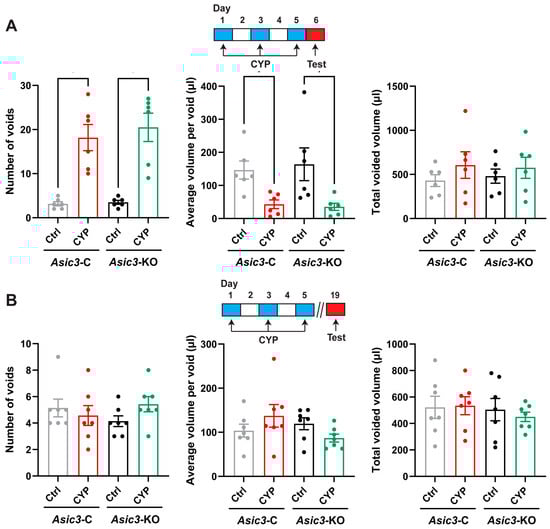 We next explored the contribution that ASIC expressing afferents have in bladder pathophysiology. CYP is an alkylating agent used for chemotherapy for an array of cancers as well as an immune suppressor in nephrotic syndrome, granulomatosis with polyangiitis, and following organ transplantation []. CYP is converted to acrolein by microsomal enzymatic hydroxylation in the liver []. Cystitis, a common side effect observed in patients that receive CYP [,], ensues as acrolein accumulates in the urinary bladder causing pelvic allodynia (i.e., pain due to a stimulus that does not normally provoke pain), frequent voiding events of low volume and inflammation. We have previously shown that Asic3 null mice are more sensitive to CYP than control mice developing pelvic allodynia with fewer doses of the alkylating agent []. Asic3-C and sensory neuron conditional Asic3-KO mice were injected intraperitoneally with CYP (80 mg/Kg) every other day for five days. To assess conscious voiding behavior in freely moving female mice, we used a recently described video-monitored void-spot assay [,,]. Behavioral testing was conducted a day after receiving the last dose of CYP or saline (acute) and two weeks later (chronic) (Figure 5). Micturition frequency, the volume of individual voiding events and total voided volume were evaluated in a 6 h time window during the mice active dark phase. In the acute setting, both Asic3-C and Asic3-KO mice treated with CYP exhibit frequent urination with voiding events of smaller volume than mice that received saline (Figure 5A). Interestingly, two weeks after receiving the last dose of CYP, the voiding behavior of Asic3-C and conditional Asic3-KO mice was indistinguishable from that of mice that received saline (Figure 5B). In sum, conditional deletion of Asic3 from sensory neurons does not alter voiding behavior. The changes in voiding behavior induced by CYP treatment in both control and sensory neuron conditional Asic3-KO mice are transitory and reversible.