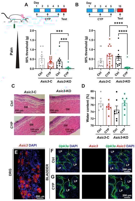 ASIC3 averts pelvic pain in mice exposed to CYP. The protocol for evaluation of behavioral changes following cyclophosphamide (CYP) administration for each condition is shown on the top. (A,B), 50% withdrawal threshold (g) to von Frey filaments in the pelvic area was evaluated a day (A) or two weeks (B) after the last dose of saline (Ctrl) or CYP for female control (Asic3-C) and sensory neuron conditional Asic3-KO mice (n = 10–16). Dots indicate individual data points. Data were analyzed using the Kruskal–Wallis test followed by Dunn’s multiple comparisons test and significant differences indicated with a triple asterisk (p ≤ 0.001) or a quadruple asterisk (p ≤ 0.0001). (C), Asic3-KO mice treated with CYP do not exhibit signs of bladder inflammation. Bladder sections from Asic3-C and Asic3-KO mice treated with saline or CYP were stained with hematoxylin and eosin (n = 2 for each group). Tissues were harvested two weeks after the last dose of saline or CYP. SM, smooth muscle; Ut, urothelium. (D), Tissue water content of urinary bladders from Asic3-C and conditional Asic3-KO mice treated with saline or CYP (n = 7, NS; Kruskal–Wallis test followed by Dunn’s multiple comparisons test). Tissues were harvested two weeks after the last dose of saline or CYP. Dots indicate individual data points. (E–G), Asic3 is not expressed in bladder tissues. Confocal images are shown. Fluorescence in situ hybridization was performed with probes for Asic3 and Upk3a. Bladder cryosections from wild type mice that received saline (F) or CYP (80 mg/Kg) (G) every other day for a week. Note that single Asic3 RNA particles were detected in DRG from wild type mice (E), but not in bladder tissues (F,G). The urothelial marker Upk3a is highly expressed in umbrella cells with the lowest expression in the basal cells. LP, lamina propria; L, lumen.