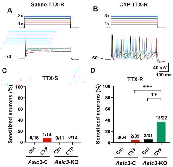 The presence of pelvic pain in conditional Asic3-KO mice treated with CYP that persists after the resolution of the inflammation alludes to the sensitization of central nociceptive pathways. Peripheral sensitization, which represents an amplification in the responsiveness of nociceptors that occurs when terminals are exposed to noxious stimuli, in general, requires a pathological condition to be sustained []. To investigate whether long-term allodynia in conditional Asic3-KO mice treated with CYP is driven, at least in part, by sensitized bladder afferents, we examined the firing of acutely isolated bladder sensory neurons of Asic3-C and conditional Asic3-KO mice treated with saline or CYP. Neurons were isolated from mice two weeks after the last dose of CYP (or saline) and electrophysiological studies were performed within 2 and 8 h of isolation. Sensory neurons were classified according to the sensitivity of the action potential to tetrodotoxin (TTX), as TTX-resistance (TTX-R) or TTX-sensitive (TTX-S). To assess neuron excitability, we applied an electrical stimulus with an intensity equal to 1, 1.5, 2, 2.5 and 3 times (X) the rheobase (i.e., minimal electrical current required to evoke an action potential) (Figure 7A,B). Most bladder sensory neurons from naïve mice discharge a single action potential in response to suprathreshold stimulation []. Thus, neurons that discharge more than an action potential in response to suprathreshold electrical stimulation were considered sensitized. Our studies show that most neurons isolated from Asic3-C mice treated with saline or CYP discharged a single action potential in response to suprathreshold stimulation (Figure 7C,D). Interestingly, a significant proportion (13 out of 35 neurons, 37%) of bladder sensory neurons with TTX-R action potentials of conditional Asic3-KO mice treated with CYP discharge multiple action potentials upon electrical stimulation (Figure 7D). Taken together, these findings suggest that ASICs control the sensitization of a subgroup of bladder nociceptors.