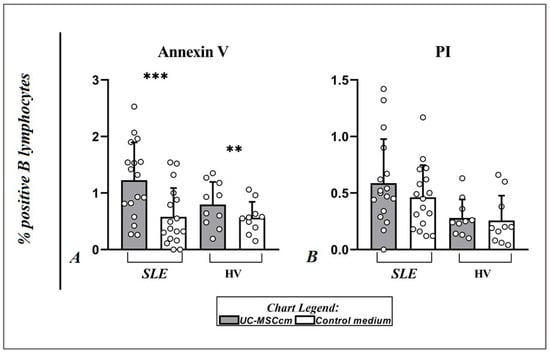 2.4. Influence of MSC Secretome on Apoptotic and Necrotic CD19+ B Cells from Peripheral Mononuclear Cells