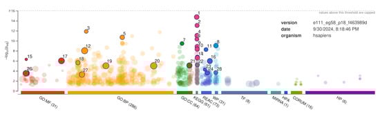 - Raudvere, U.; Kolberg, L.; Kuzmin, I.; Arak, T.; Adler, P.; Peterson, H.; Vilo, J. g: Profiler: A web server for functional enrichment analysis and conversions of gene lists (2019 update). Nucleic Acids Res. 2019, 47, W191–W198. [Google Scholar] [CrossRef]