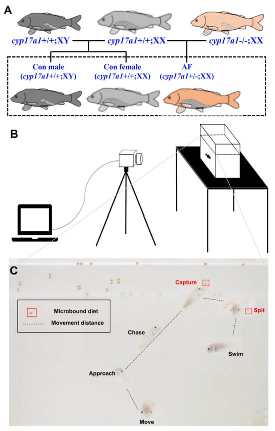 Li, X.; Zou, Q.; Liu, X.; Lou, Q.; Jin, X.; He, J.; Yin, Z.; Zhai, G.; Duan, M.; Chen, G. Characterization of Feeding Behaviors, Appetite Regulation and Growth Performance of All-Female (cyp17a1+/−;XX Genotype) Common Carp (Cyprinus carpio). Int. J. Mol. Sci. 2024, 25, 12517. https://doi.org/10.3390/ijms252312517