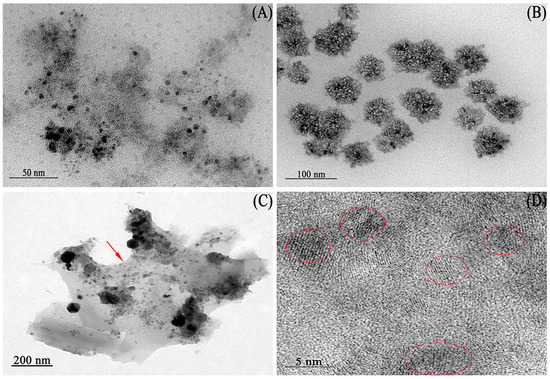 The MNPs were biosynthesized by the strain B. cepacia CG-1 (as shown in Figure S1), and their transmission electron microscopy (TEM) images are presented in Figure 1. The images revealed that the sizes of the purified magnetic nanoparticles were uniform, with a distribution of about 4.21 ± 0.09 nm when B. cepacia CG-1 was cultured for 3 days (Figure 1A and Figure S2A). However, when the incubation time was increased to 5 days, the bacterial population and vitality increased as the cultivation time increased, resulting in an increase in absorbable Fe ions and an increase in synthesized magnetic nanoparticles [19]. The MNPs formed nanoclusters with an average size of 66.87 ± 0.56 nm (Figure 1B and Figure S2B). Additionally, the TEM image (Figure 1C) showed that the MNPs were surrounded by a membrane (marked with an arrow). This demonstrated that the surface of the nanoparticles had a biofilm; the biofilm activity was strong and attracted other biofilms, leading to the aggregation of nanoparticles into clusters when they existed in the live cell [20]. To further study the microstructure of the MNPs, high-resolution transmission electron microscopy (HRTEM) was used at a magnification of 800,000× and an accelerating voltage of 200 kV. The results revealed that the MNPs were formed by the aggregation of crystals with a size of about 5 nm, and the neat arrangement of atoms could be clearly observed (Figure 1D).