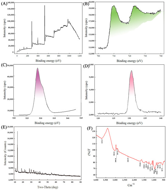 (A–D): XPS analysis of the MNPs ((A): XPS wide spectrum of the MNPs; (B): XPS narrow spectrum of Fe 2p; (C): XPS narrow spectrum of O 1 s. (D): XPS narrow spectrum of P 2p); (E): XRD pattern of the MNPs; (F): FTIR spectrum of purified the MNPs.