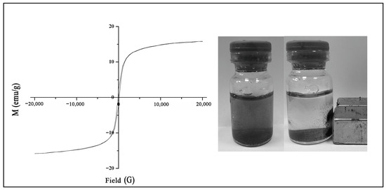 The hysteresis loop of the MNPs is depicted in Figure 3. The hysteresis parameters, including the coercivity, saturation remanence, and saturation magnetization, were measured to be 151 Oe, 2 emu/g, and 16 emu/g, respectively. These results suggest that the MNPs display ferromagnetic behavior and can be classified as semi-hard magnetic materials. This information is important for understanding the magnetic properties of the nanoparticles and their potential applications in various fields, such as data storage, magnetic separation, and biomedical applications.